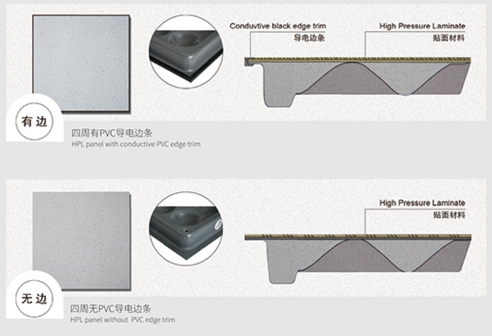 - السطح العلوي: صفائح HPL مضادة للكهرباء الساكنة (مقاومة للحريق، ومقاومة للتآكل)